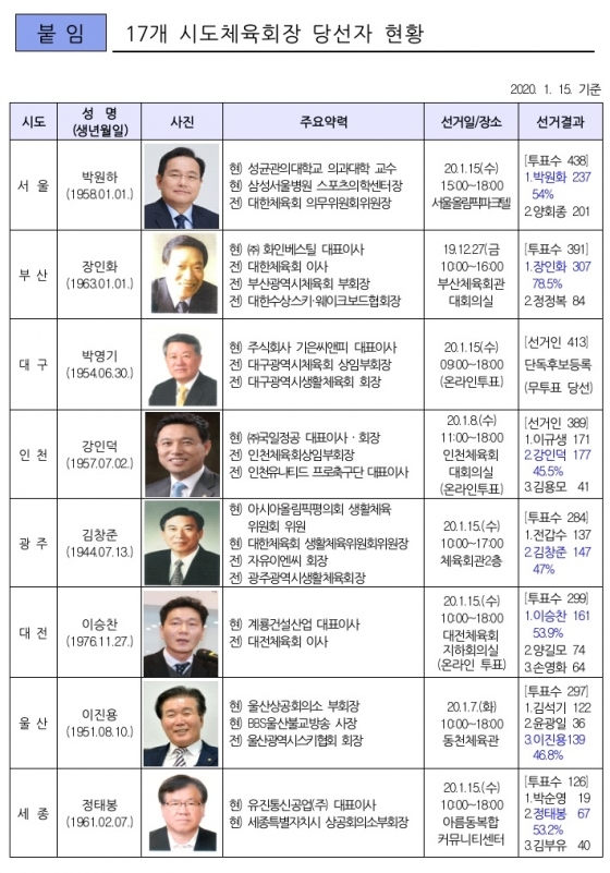 서울시체육회에서는 박원하(62)씨, 부산시에서는 장인화(57)씨, 경기도는 이원성(61)씨 등이 회장으로 당선됐다.