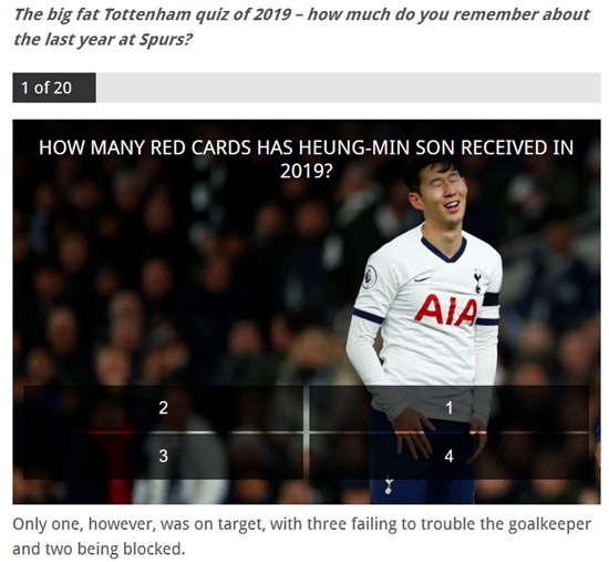 퀴즈의 1번 문제는 “손흥민이 2019년 받은 레드 카드의 개수는?”이다. 퀴즈 제작자는 토트넘의 골수팬이라면 맞힐 수 있는 난이도, 그리고 보는 이의 관심을 잡아 끌 만한 소재라고 판단한 듯하다. (정답은 3회)