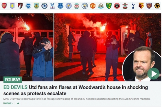 영국 언론 '더선'은 29일(한국시간) "체셔 지역의 있는 우드워드 부사장의 자택이 일부 과격한 맨유 팬들로부터 공격을 받았다. 얼굴을 덮은 발라클라바 모습을 한 소수 팬들은 우드워드 부사장 자택으로 조명탄을 던지는 행동을 비디오로 찍었다"고 밝혔다. 같은 시간 소셜미디어사이트 스냅챗에 '우드워드 사망'이라는 캡션이 게시되면서 고의적인 범죄로 가닥이 잡혔다.