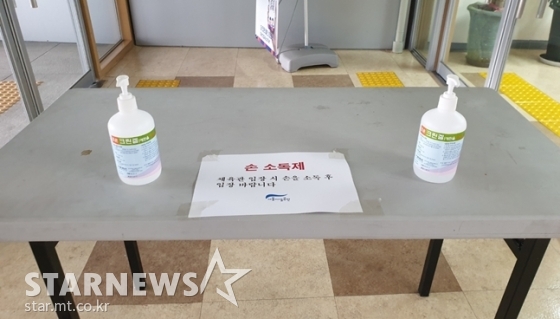 GS칼텍스 관계자는 "연맹 지침에 따라 손 세정제는 수를 늘려 각 출입문마다 비치한 상태다"고 설명했다. 출입문뿐만 아니라 화장실 앞에도 손 세정제가 비치됐다.