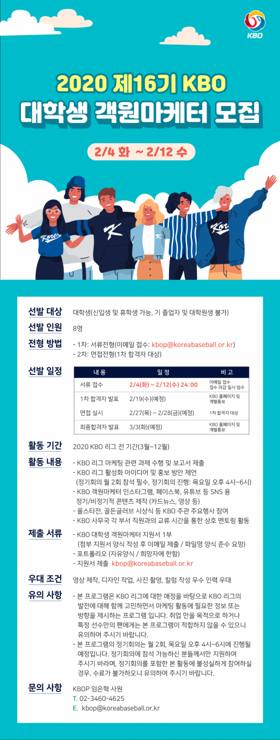 KBO 대학생 객원마케터는 서류 전형과 면접을 거쳐 총 8명이 선발된다. 콘텐츠 제작을 위한 영상 제작, 디자인 작업, 사진 촬영, 칼럼 작성 능력 등이 뛰어난 대학생을 우대 선발할 예정이다.
