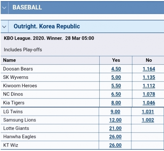 한화 이글스와 KT 위즈는 나란히 26배를 받으며 최하위를 다툴 것으로 예상됐다. 특히 KT는 지난해 승률 5할로 6위에 오르며 팀 역대 최고 성적을 거뒀지만 도박사들의 높은 평가를 이끌어내진 못했다.