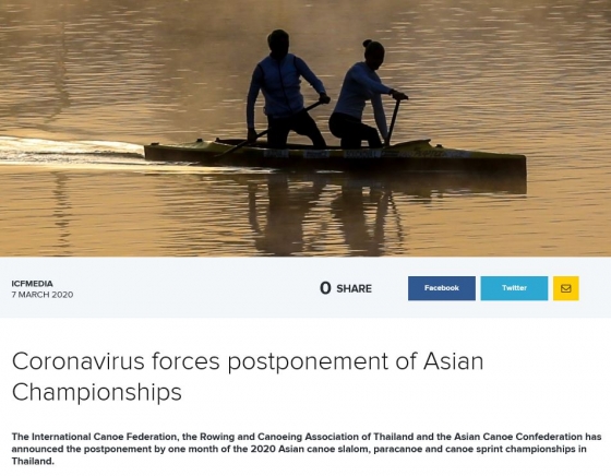 아시아카누연맹(ACC)이 세계적으로 확산되고 있는 코로나19의 영향으로 태국 파타야에서 개최 예정이던 카누 아시아카누선수권 대회가 4월로 연기됐다고 밝혔다.