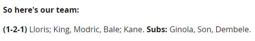 이 매체가 선정한 5명의 선수는 위고 요리스(GK), 레들리 킹(DF), 루카 모드리치(MF), 가레스 베일(MF), 해리 케인(ST)이다. 두 명의 미드필더 자리가 가장 치열했는데, 마이클 캐릭, 에드가 다비즈, 무사 뎀벨레, 다비드 지놀라, 손흥민, 라파엘 판 더 바르트, 델레 알리 등이 경쟁했다.