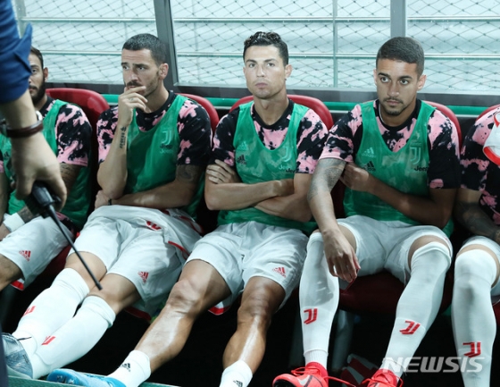 지난해 7월 26일 서울월드컵경기장에서 열린 팀 K리그와 유벤투스 FC의 친선경기에서 유벤투스의 호날두(가운데)가 벤치에 앉아 있다./사진=뉴시스
