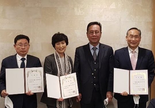 조한호 회장(오른쪽 두번째)대한승마협회 신임 회장과 선입장을 받은 안성국(오른쪽) 정정희, 전영중 부회장이 포즈를 취하고 있다./사진제공=대한승마협회