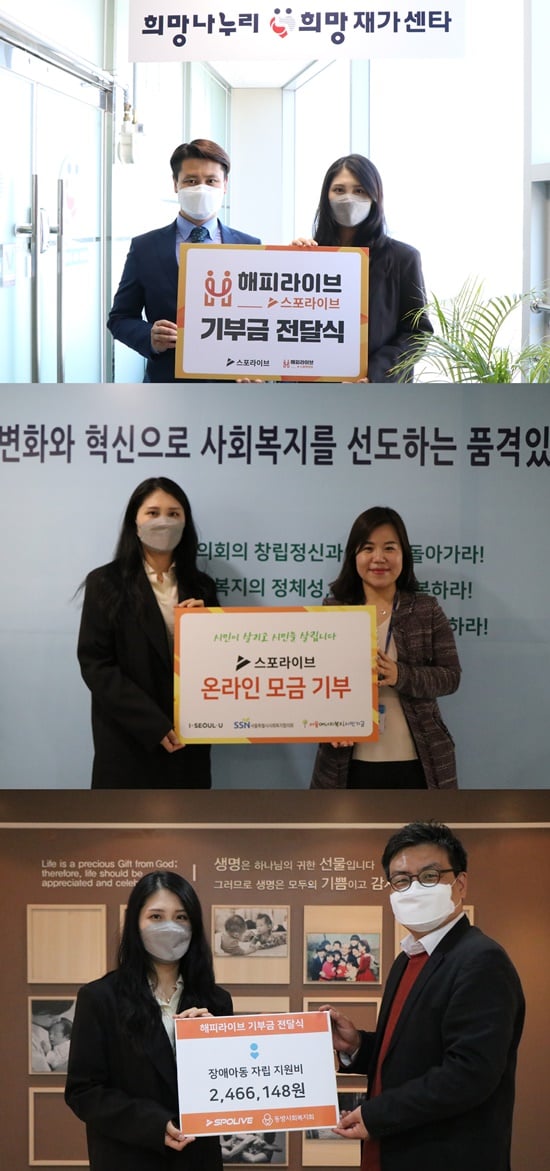 [스포탈코리아] 이은경 기자= 스포츠승부예측게임 ‘스포라이브(SPOLIVE)’는 14일 서울과 경기도에 위치한 복지기관 3곳에 해피라이브 7기 모금액 1,621만 5,663원을 전달했다.