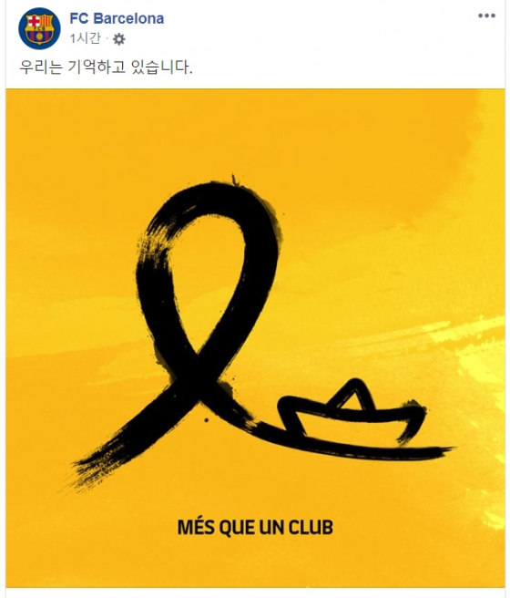바르사는 16일 오전 구단 공식 페이스북을 통해 노란색 바탕에 검은색의 리본과 작은 배가 그려진 이미지를 게재했다. 이미지 하단에는 바르사의 상징 문구인 ‘Mes Que un Club(클럽 이상의 클럽)이 적혀 있었다.
