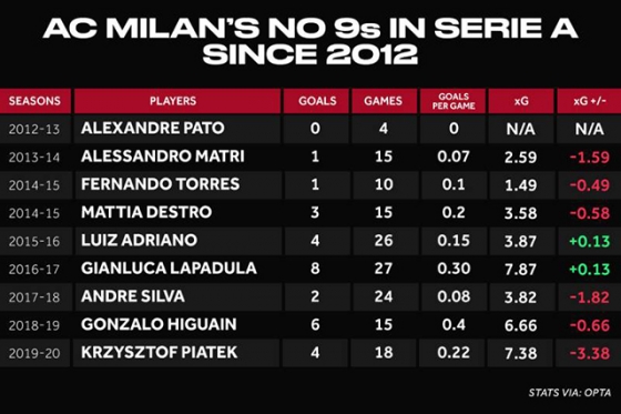[스포탈코리아] 김성진 기자= AC 밀란이 8년째 등번호 9번을 단 선수들이 부진을 면치 못하고 있다. 이쯤 되면 ‘9번의 저주’라고 불러도 될 듯싶다.