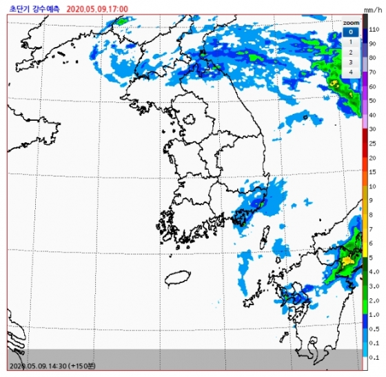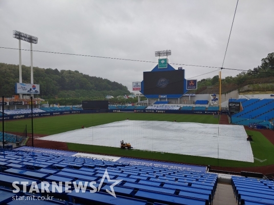 오후 3시 50분 현재 라이온즈파크 상공은 먹구름으로 덮여 있지만 빗방울은 멎었다. 대형 방수포 밑에 깔린 습기를 제거하며 그라운드 정비가 한창이다. 기상청에 따르면 9일 저녁 강수확률도 30%로 낮다. 기상청이 예측한 오후 5시 레이더 영상에도 비구름이 사라진 모습이다.