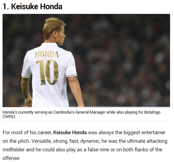 혼다 케이스케(33, 보타포구)가 1위 영예를 안았다. 매체는 “혼다는 경력의 대부분을 그라운드 위에서 보냈다. 최고의 엔터테이너였다. 다양성, 속도, 강인함, 역동성을 갖춘 공격형 미드필더였다. 가짜 9번이나 측면 날개로 뛸 수 있었다. AC밀란에서 등번호 10번을 달았다. 프로 생활이 더 탄탄대로였다면 레알 마드리드 같은 빅클럽에 가는 것도 충분했다”고 극찬했다.