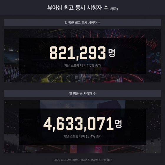 2020 LCK 스프링은 코로나19 여파로 인해 리그 개막과 동시에 무관중으로 경기를 진행했음에도 불구하고, 2019 LCK 스프링 대비 일 평균 순 시청자 수가 13.4% 증가한 463만여명을 기록했다.