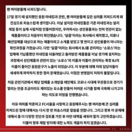 확인 결과 리얼돌 사실이 밝혀지면서 파문이 일었고, 서울 구단을 향한 비난이 쇄도했다. 결국, 서울은 공식 채널을 통해 사과문을 발표하며, 진화에 나섰지만 쉽게 가라앉지 않고 있다.