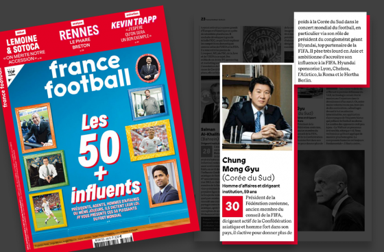 프랑스 풋볼은 정 회장을 “KFA 회장이자 전 FIFA 평의회 위원이며 한국에서 영향력 있는 인물”이라며 소개했다. 이어 “그는 대기업 현대(산업개발)의 회장으로서 세계 축구계에서 한국 축구의 위상을 높이기 위해 일하고 있다”며 “현대는 아시아에서 매우 큰 비중을 차지하고 있으며 FIFA에서 영향력을 높이는 것을 목표로 하고 있다”고 설명했다.