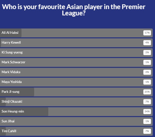 23일 0시 현재 705명이 투표에 참가한 가운데 34%의 득표율인 손흥민이 선두를 질주하고 있다. 25%의 박지성이 손흥민의 뒤를 이었다. 기성용은 저조한 2%에 머물고 있다.