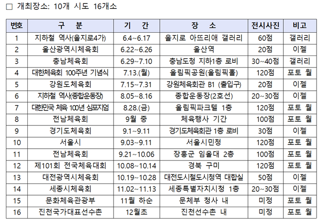 한편 대한체육회는 올해 ‘대한민국 체육 100년’을 기념하기 위해 한국체육 100년의 역사를 담은 타임캡슐 봉인식(7월 초·진천 국가대표선수촌), 대한체육회 100주년 기념식(7월 13일·서울 올림픽공원 내 올림픽홀), 한국체육 발전 방안 논의를 위한 ‘대한민국 체육 100년 심포지엄’(8월 28일·서울 올림픽 파크텔) 등 다양한 행사를 준비하고 있다.