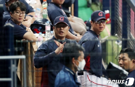 허문회 감독(오른쪽)과 코치진이 투수 교체 사인을 하고 있다. /사진=뉴스1