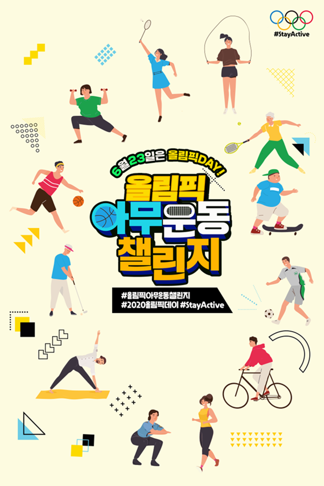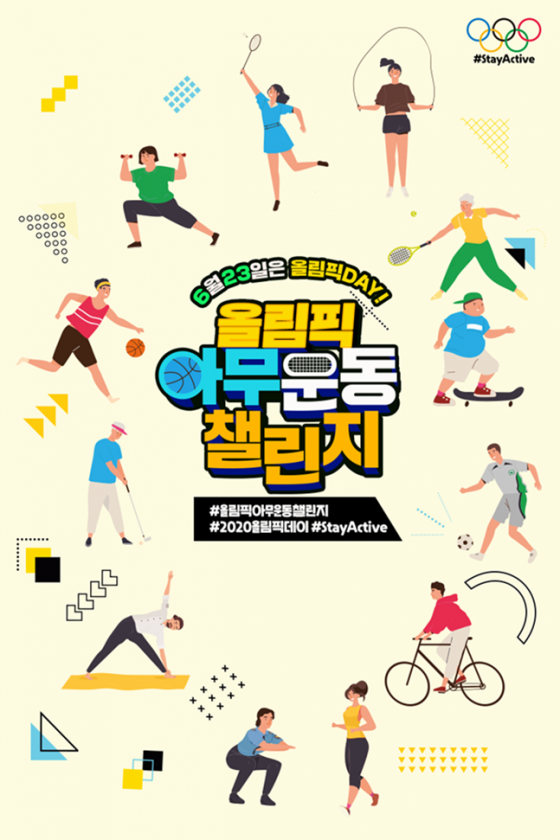 챌린지는 23일부터 7월 7일까지 2주간 온라인으로 실시하며, 우수 참가자에게는 최신 태블릿PC, 온누리상품권 등 풍성한 상품을 지급하고 선착순 2020명에게는 기프티콘을 증정한다. 참여방법은 개인 SNS(인스타그램)에 본인이 운동하는 모습이 담긴 사진 또는 영상과 지정 해시태그(#올림픽아무운동챌린지 등)를 함께 게시하면 된다.