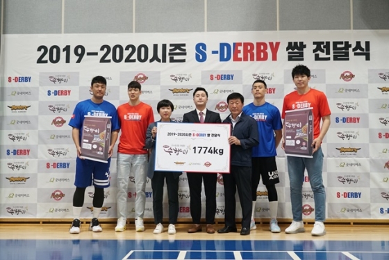 서울 SK 나이츠와 서울 삼성 썬더스가 23일 지난 시즌 S-더비 동안 적립한 화성시 특화쌀 '수향미' 1774kg을 굿네이버스 서울본부에 전달했다.