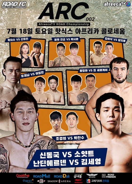 지난 5월 23일, 무관중임에도 흥행에 성공한 ARC의 두 번째 대회가 7월 18일 잠실 롯데월드 핫식스 아프리카 콜로세움에서 열린다. 이번에도 ROAD FC (로드FC)와 아프리카TV가 함께 개최하며 총 8경기, 16명의 파이터들이 출전해 기량을 겨룬다. 대회가 시작하기 전에는 아마추어리그인 ROAD FC 센트럴리그가 개최, 세미 프로 경기가 10경기 진행된다. 7월 18일 ARC 002 대회 케이지에 오르는 출전 선수들을 살펴보자.