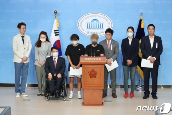 최숙현 선수의 동료들은 6일 국회 소통관에서 미래통합당 이용 의원과 함께 기자회견을 갖고 그동안 경주시청 팀 소속 가해자들에게 당한 구체적인 피해 사례를 밝혔다.