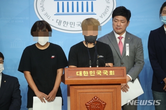 미래통합당 이용 의원은 6일 국회 소통관에서 기자회견을 개최했다. 선배 선수가 최숙현에게 가혹 행위를 한 모습을 직접 봤거나 피해를 입었다고 주장하는 추가 피해자들이 직접 취재진 앞에 섰다.