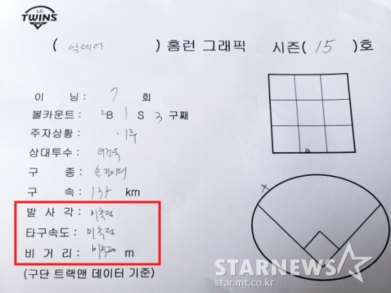 이날 LG 구단이 제공한 기록지에는 홈런을 허용할 당시 여건욱이 던진 구종과 구속이 모두 기록돼 있었다. 그러나 알테어가 때린 홈런의 발사각과 타구 속도, 그리고 비거리는 모두 '미측정'으로 나와 있었다.