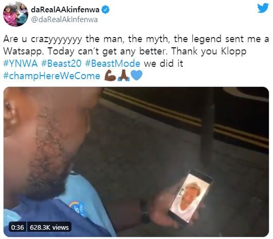 아킨펜와가 농담으로 건넨 말이 현실이 됐다. 클롭 감독이 진짜 아킨펜와에게 영상 메시지를 보낸 것. 클롭 감독은 "안녕 빅맨, 축하한다! 경기를 봤지만 인터뷰는 보지 못했다. 조던 헨더슨이 내게 인터뷰 내용을 알려줬다"고 말했다. 이에 아킨펜와는 해당 영상을 자신의 SNS에 공유하며 기쁨을 감추지 못했다.