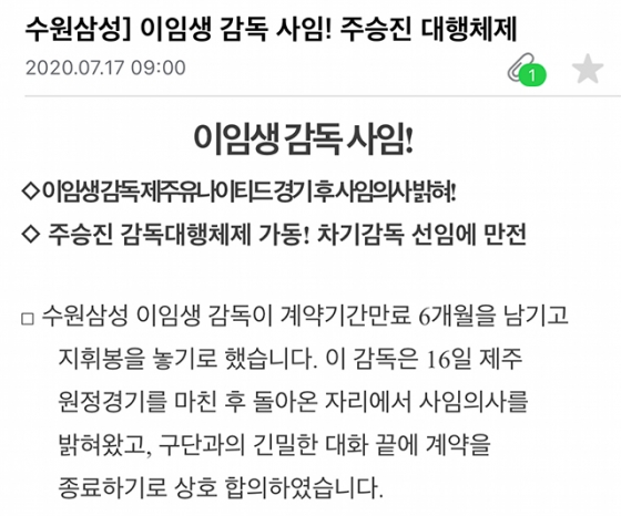 수원은 17일 오전 이임생 감독 사임 관련 보도자료를 배포했다. 그런데 보도자료에 제목에 느낌표가 있었다.‘이임생 감독 사임!’이라고 표기됐다.