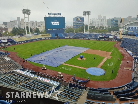 창원에 비가 그쳤다. NC 다이노스는 창원 NC파크에 덮인 대형 방수포를 걷고 그라운드 정비에 돌입했다.