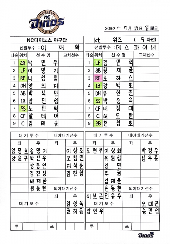 19일 오후 5시부터 창원 NC파크에서는 2020 KBO리그 KT 위즈와 NC의 팀 간 9차전이 열린다. 이날 오전부터 비가 내려 플레이볼이 불투명했지만 오후 3시를 지나며 빗방울이 멈췄다.