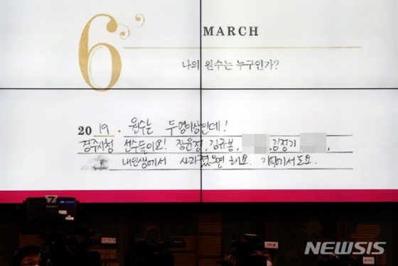 '나의 원수는 누구인가'라는 제목이 적힌 다이어리에는 "원수는 두 명 이상인데. 경주시청 선수들이요. 장윤정, 김규봉, 이OO, 김정기, 김OO. 내 인생에서 사라졌으면 해요. 기억에서도요"라고 쓰여 있었다.