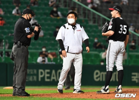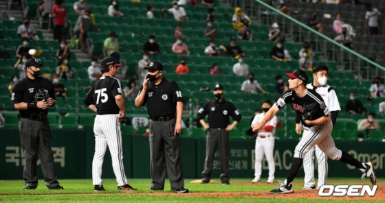 LG가 10-2로 앞선 5회말. SK 선두타자 최지훈을 상대로 윌슨이 초구 스트라이크를 던졌다. 그런데 거의 곧바로 구명환 주심과 이영재 2루심이 마운드로 다가와 윌슨의 투구 동작을 지적했다. 세트 포지션 자세에서 발을 구르는 동작에 대해 지적한 것이다. 류중일 감독까지 마운드로 걸어와 이영재 2루심을 향해 3분 넘게 어필하며 맞섰다.