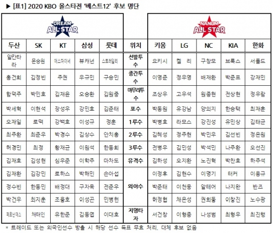 10일부터 시작되는 이번 투표는 두산, SK, KT, 삼성, 롯데가 속한 드림 올스타와 키움, LG, NC, KIA, 한화의 나눔 올스타로 팀을 나눠, 각 구단으로부터 후보를 추천받아 팬 투표로만 ‘베스트12’ 총 24명이 최종 확정된다.