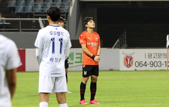 제주는 10일 오후 7시30분 제주월드컵경기장에서 열리는 하나원큐 K리그2 2020 14라운드 홈 경기에서 충남아산과 격돌한다. 선두권 도약을 위한 양보없는 한 판이었지만 훈훈한 장면이 먼저 연출됐다.