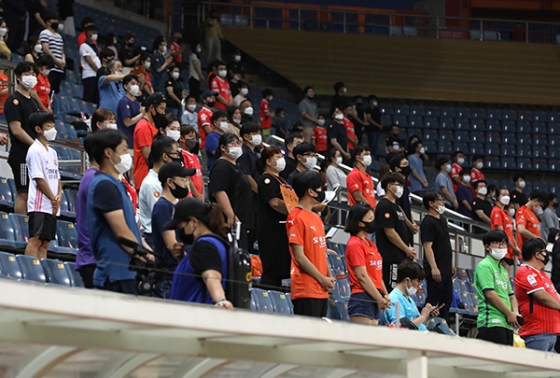 그라운드에 입장한 양팀 선수단과 이날 경기장을 찾은 제주팬들은 경기 시작전 아산 시민 및 수해 피해자들이 빠른 수해 복구로 다시 일상으로 무사히 돌아올 수 있도록 두 손을 모아 기도했다.