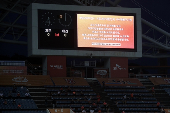이날 제주는 최근 기록적인 집중호우로 큰 피해를 입어 특별재난지역으로 선포된 충남 아산 연고팀과의 맞대결임을 감안해 킥오프를 앞두고 아산 시민 및 수해 피해자에게 위로와 격려를 보내는 시간을 가졌다.