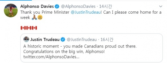 캐나다 국적으로 사상 처음으로 유럽축구연맹(UEFA) 우승 트로피를 들어올린 측면 수비수 알폰소 데이비스(20·바이에른 뮌헨)가 쥐스탱 트뤼도(49) 캐나다 총리의 축전에 진심 어린(?) 부탁을 남겼다.