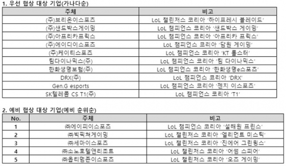 2차 심사를 통해 확정된 우선 협상 대상 10개 기업은 ▲(주)브리온이스포츠 ▲(주)샌드박스게이밍 ▲(주)아프리카프릭스 ▲(주)에이디이스포츠 ▲(주)케이티스포츠 ▲팀다이나믹스(주) ▲한화생명보험(주) ▲DRX(주) ▲Gen.G esports ▲SK텔레콤 CS T1(주) (이상 가나다순)이며, 예비 협상 대상 5개 기업은 ▲(주)에이피이스포츠 ▲(주)빅픽쳐게이밍 ▲(주)세마이스포츠 ▲(주)소노호텔앤리조트 ▲(주)옵티멈존이스포츠 (이상 예비 순위순)이다.