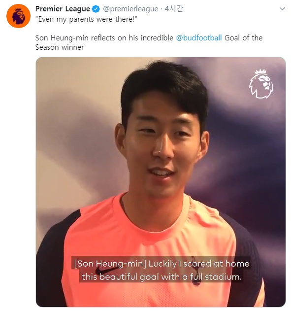 2019~2020시즌 '올해의 골' 수상자로 선정된 손흥민(28·토트넘 홋스퍼)이 소감을 전했다. 부모님도 당시 현장에 있었다고 했다.