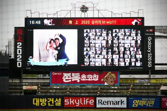 수원 KT 위즈 파크에 결혼 축가가 울려 퍼졌다. 단순한 이벤트가 아닌 진짜 결혼식이 열렸다. 행복의 주인공은 신랑 임지완(36)-신부 최효미(34) 커플. KT는 12일 수원 KT 위즈 파크에서 열린 한화 이글스와 홈경기에 앞서 임지완, 최효미 씨의 언택트 결혼식을 개최했다.