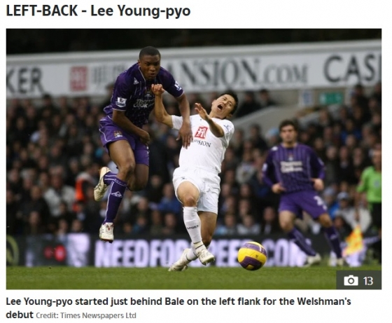 이영표는 베일 뒤에 섰다. 레프트백이었다. 더 선은 "토트넘의 이전 풀백 이영표는 아인트호벤에서 이적했다. 화이트하트레인(토트넘의 이전 홈구장)에서 2005년부터 2008년까지 활약했다. 대한민국 국가대표로 127경기에 출전했다. 지금은 은퇴한 것으로 보인다"고 설명했다.