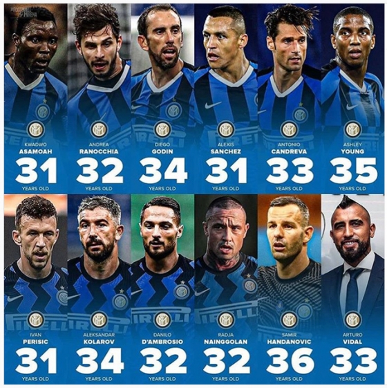 인터 밀란은 2020/2021시즌을 대비해 9명이 선수를 영입했다. 그중 2명이 30대다. 알렉시스 산체스(31)와 아르투로 비달(33)이다. 또한 바이에른 뮌헨에서 임대 복귀한 이반 페리시치(31)도 30대 선수다.