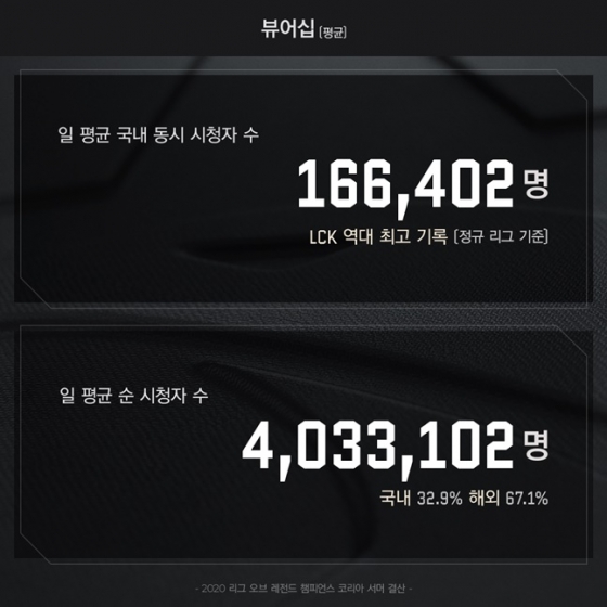 일 평균 국내 동시 시청자 수는 약 16만 6000여명으로, 지난해 서머 대비 약 74% 증가하며 LCK 역대 최고 기록을 갱신했다. 일 최고 동시 시청자 수도 30만 명을 기록하며 지난 서머 대비 66% 증가했다. 또한, 일 평균 순 시청자수 역시 지난해 서머 대비 소폭 증가한 403만여 명을 기록했다. 이 가운데 절반이 넘는 67%(약 270만 명)가 해외 시청자로 나타났다.