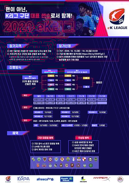 "eK리그 2020"은 글로벌 게임회사 EA스포츠의 "FIFA 온라인 4"를 기반으로 하는 e스포츠 대회다. 참가자들은 K리그의 각 구단을 대표하는 자격으로 이 대회에 참여하게 된다. 이러한 방식의 e스포츠 대회는 국내 프로스포츠 종목 중 최초이며, 국제축구연맹(FIFA)으로부터 인증을 받은 국내 유일의 대회다.