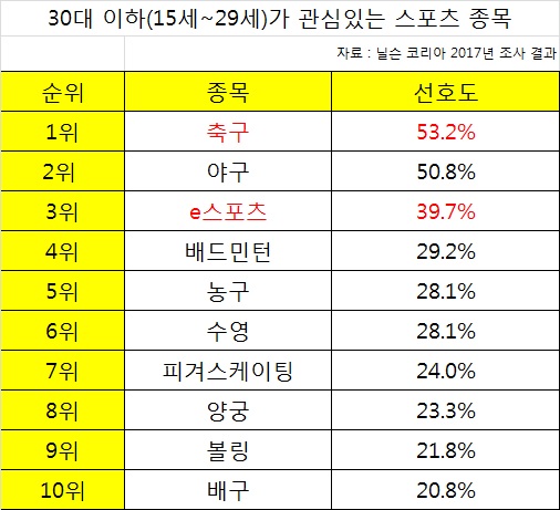 한국에서도 e스포츠는 10대와 20대(15~29세)에게 큰 관심을 받는 종목이다. 2017년 닐슨코리아 조사에서 축구가 53.2%로 가장 선호도가 높았고 야구가 50.8%로 그 뒤를 잇는다. e스포츠는 39.7%로 3위다.