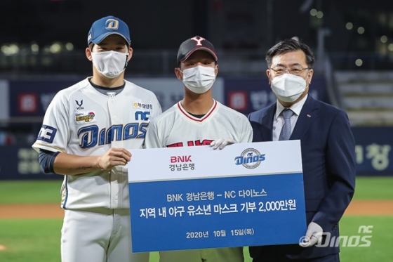 NC 다이노스가 BNK경남은행과 함께 경남지역 유소년 야구선수들을 위해 마스크를 기부했다. 유소년 선수들이 코로나19 예방수칙을 지키며 더 안전하게 훈련할 수 있도록 돕기 위해서다.