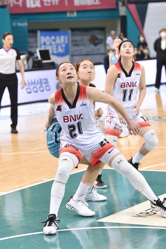 특히 19일 부천에서 열리는 부천 하나원큐전은 더욱 부담이 될 수밖에 없었다. 하나원큐는 좋은 높이가 특징인 팀. 이적생 양인영(184cm)을 비롯해 이정현(187cm), 이하은(182cm) 등 빅맨 자원이 풍부했다. 이들의 평균 신장은 184.33cm나 됐다. 만만치 않은 싸움이었다. 실제로 이날 BNK는 리바운드 싸움 37-46으로 패했다.