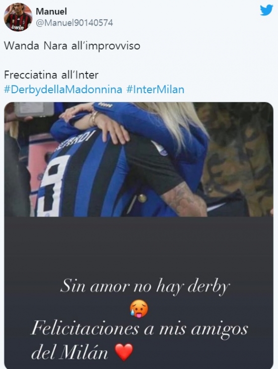 완다는 “사랑 없이 더비는 없다. 밀란의 친구들 축하한다”며 인터밀란 유니폼을 입고 있는 이카르디와 포옹하는 사진을 올렸다.