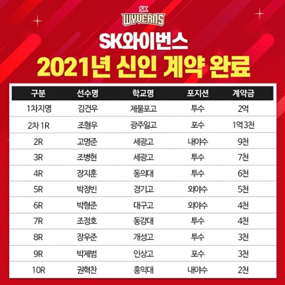SK는 1차 지명한 김건우(제물포고, 투수)와 계약금 2억원에 입단 계약을 체결했다. 김건우는 짧고 간결한 팔스윙에서 나오는 최고 구속 146km의 직구와 함께 수준급 슬라이더와 서클 체인지업을 구사한다.